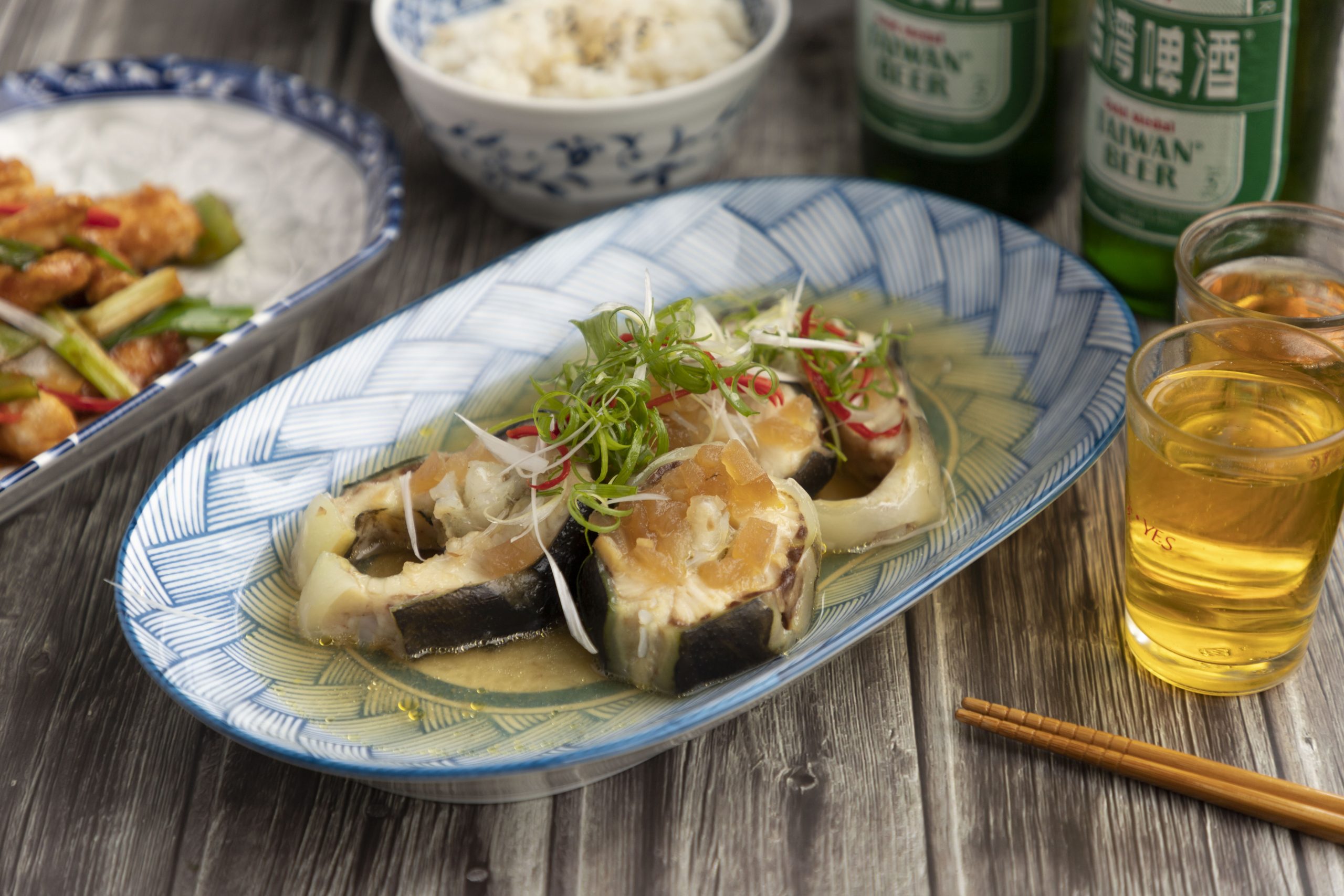 步驟1:退冰後將魚肉洗淨,以紙巾壓乾,將魚肉鋪在盤子上,放薑絲、蒜頭、微量蠔油、樹子、鹹冬瓜(蠔油與鹹冬瓜選1即可),再撒一些米酒,放入電鍋蒸約15分鐘。