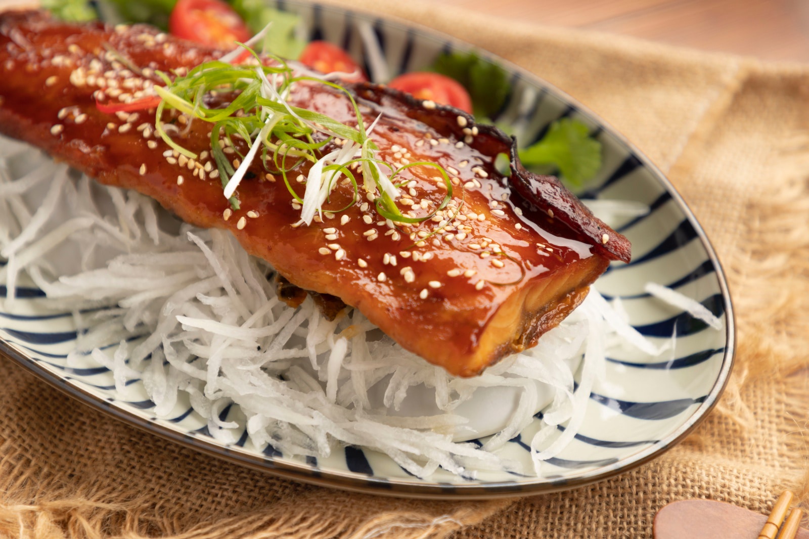 首頁 9 蒲燒鱘龍魚 蒲燒鱘龍魚 冷食:退冰解凍後,魚肉變軟即可直接切片食用 熱食:解凍後,放入微波爐或烤箱,加熱約3分鐘後再塗上一些照燒醬或烤肉醬增添風味,繼續放入加熱直至魚肉熱透,取出撒上白芝麻即可上桌。