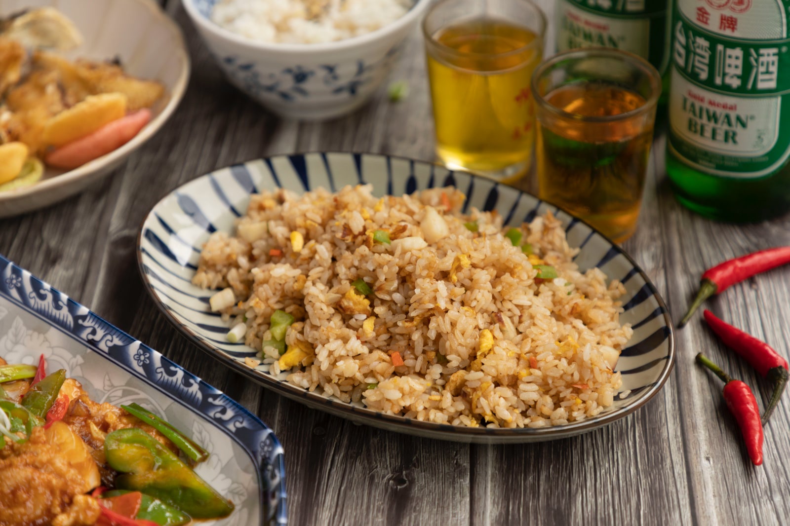 材料:一片鱘魚肉切成丁、蛋兩顆、白飯、少許胡椒、鹽巴、兩湯匙醬油、30公克洋蔥、30公克青椒